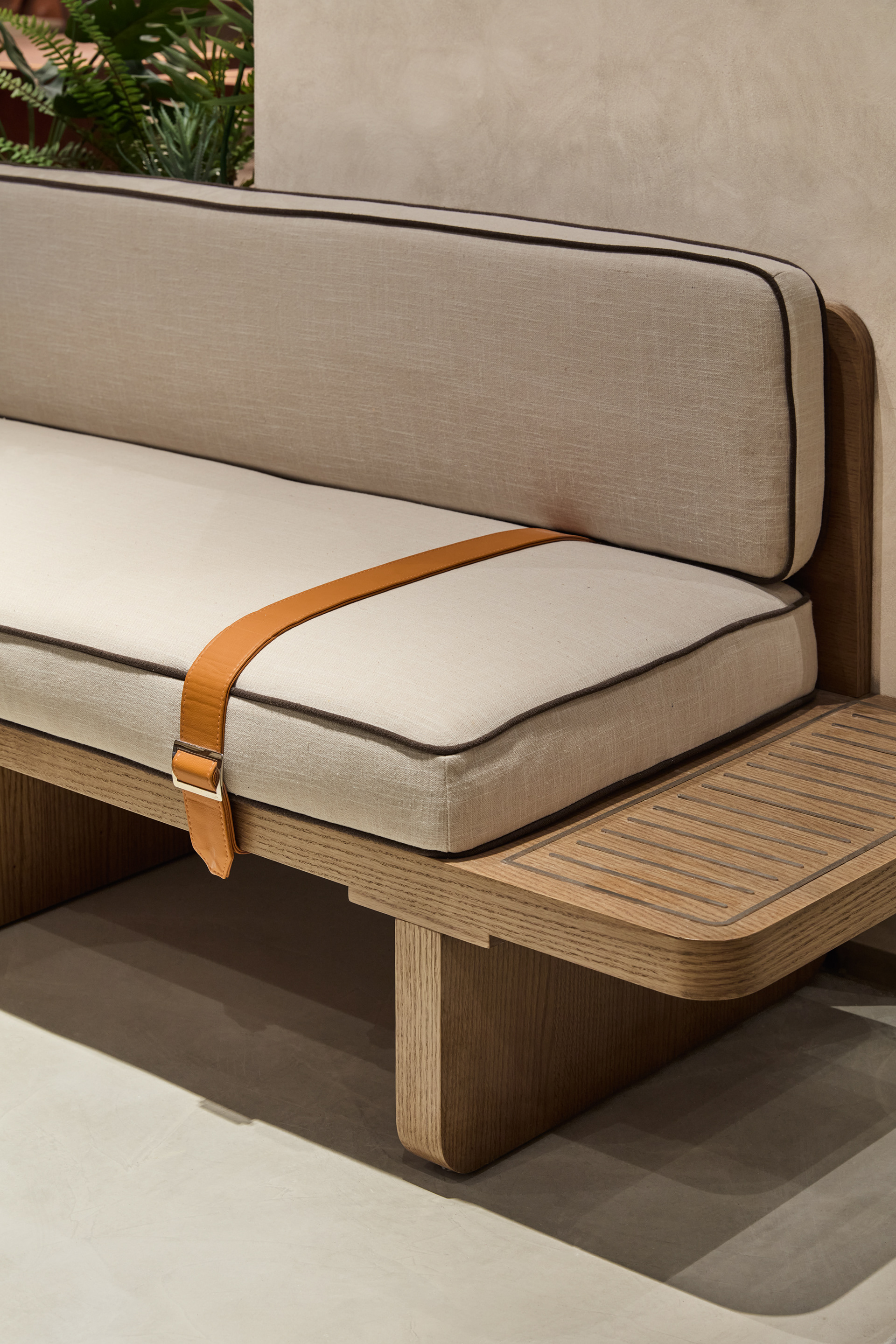 Materials are carefully chosen to reflect the symbolism of the path: hand-applied grey plaster represents the imperfection of each step. Light wood is used in the seating area to bring warmth, while darker wood defines a space for long conversations. The take-away area is finished in warm brown tones, emphasizing the brief nature of the stop.