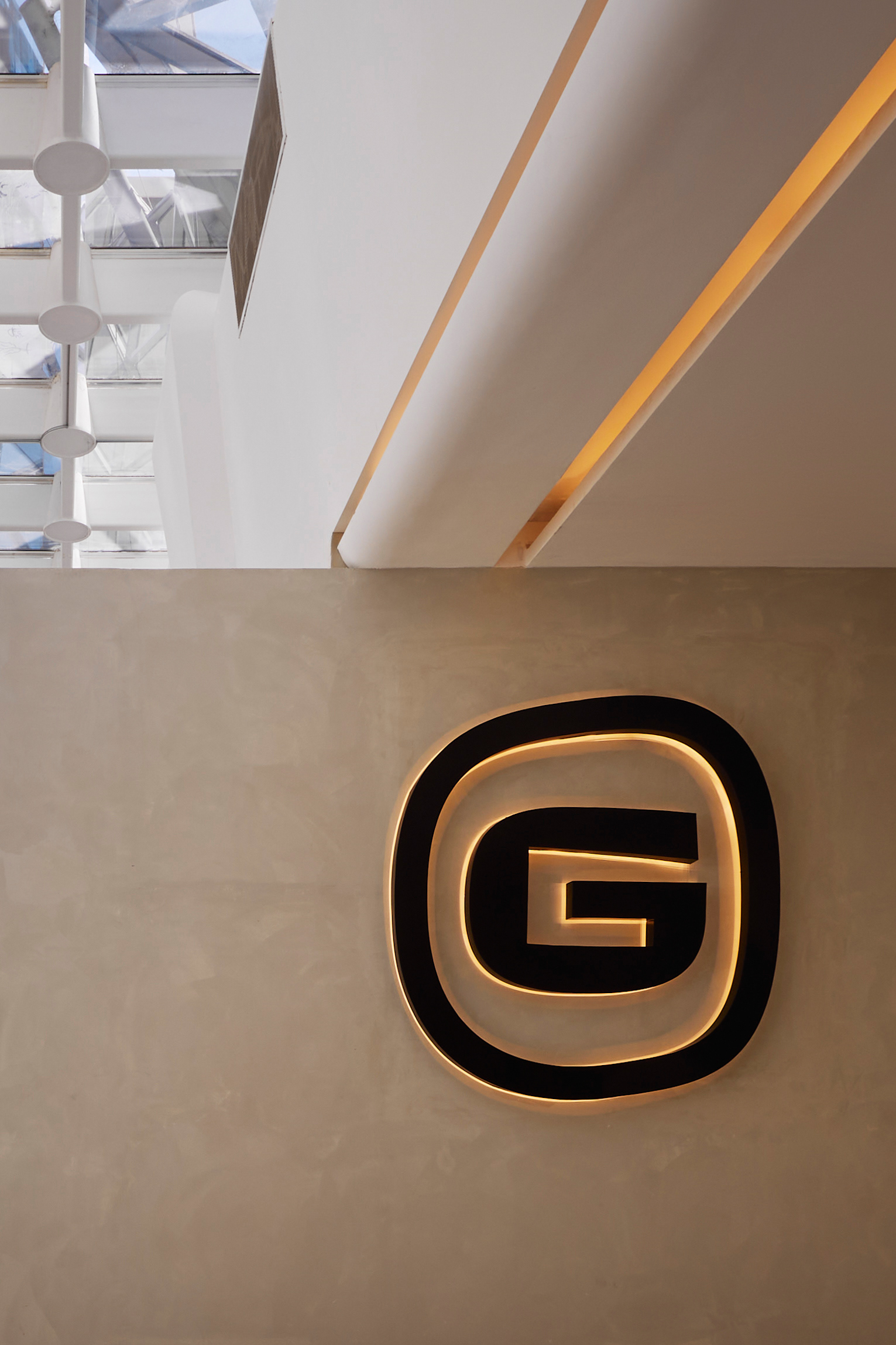 The project is a collaboration between two brands—Gymnasium and the Paris Saint-Germain (PSG) sports club. Its core concept is based on precise spatial zoning with minimalist cubic forms, allowing children to easily navigate and adapt. The entry begins with a concrete portal featuring a glass insert, creating a sense of transition into a special space. Visitors are greeted by three sleek white cubic forms: the reception desk bearing the Gymnasium logo. These simple forms establish an inviting entry zone, setting the stage for an environment where nothing distracts from the focus on sports.