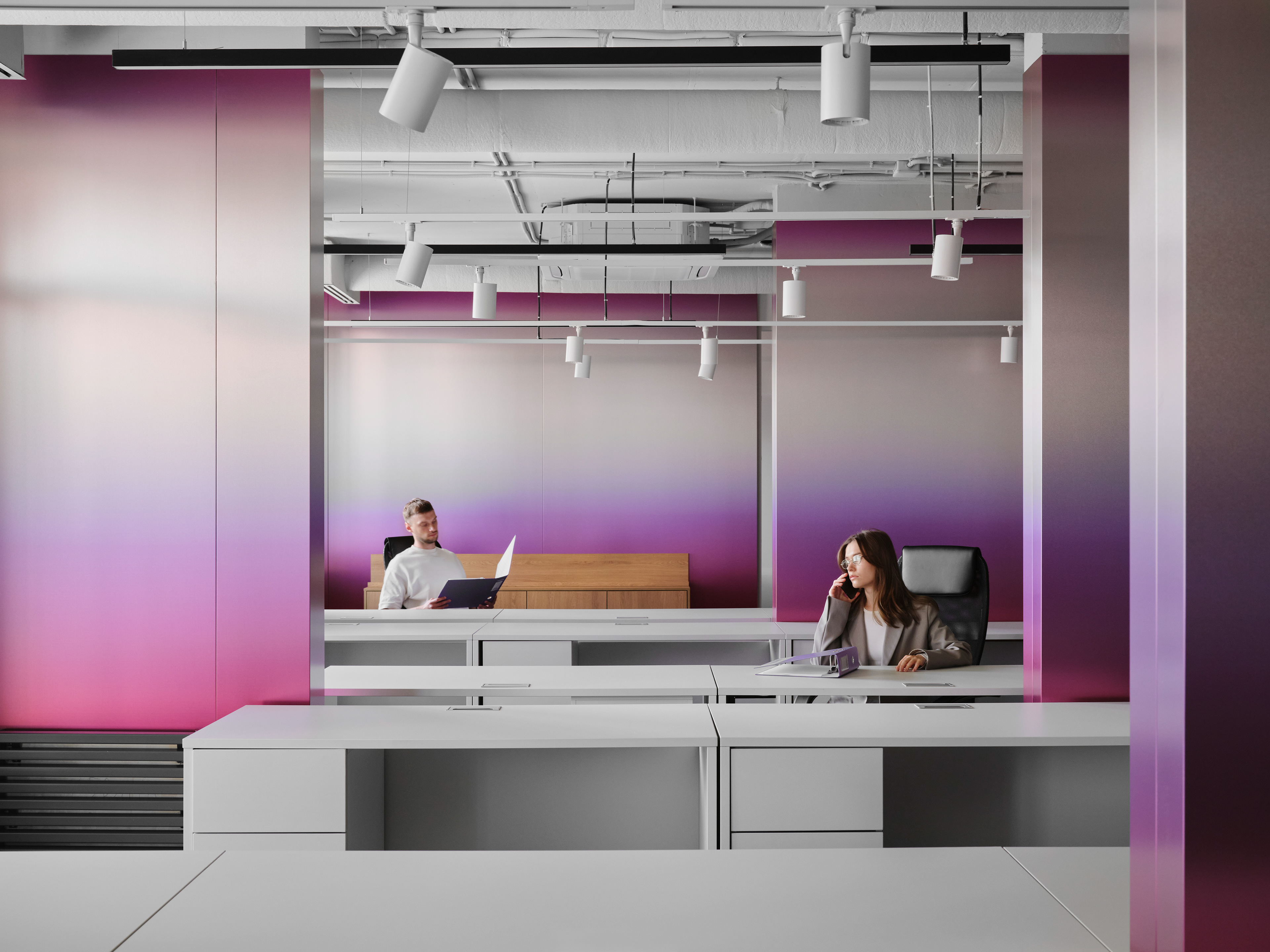 These columns are now painted in a gradient finish on stainless steel, representing the company’s brand—a technique not typically seen in similar projects. This element not only enhances the visual branding but also functions as a spatial divider, helping to organize the office zones.