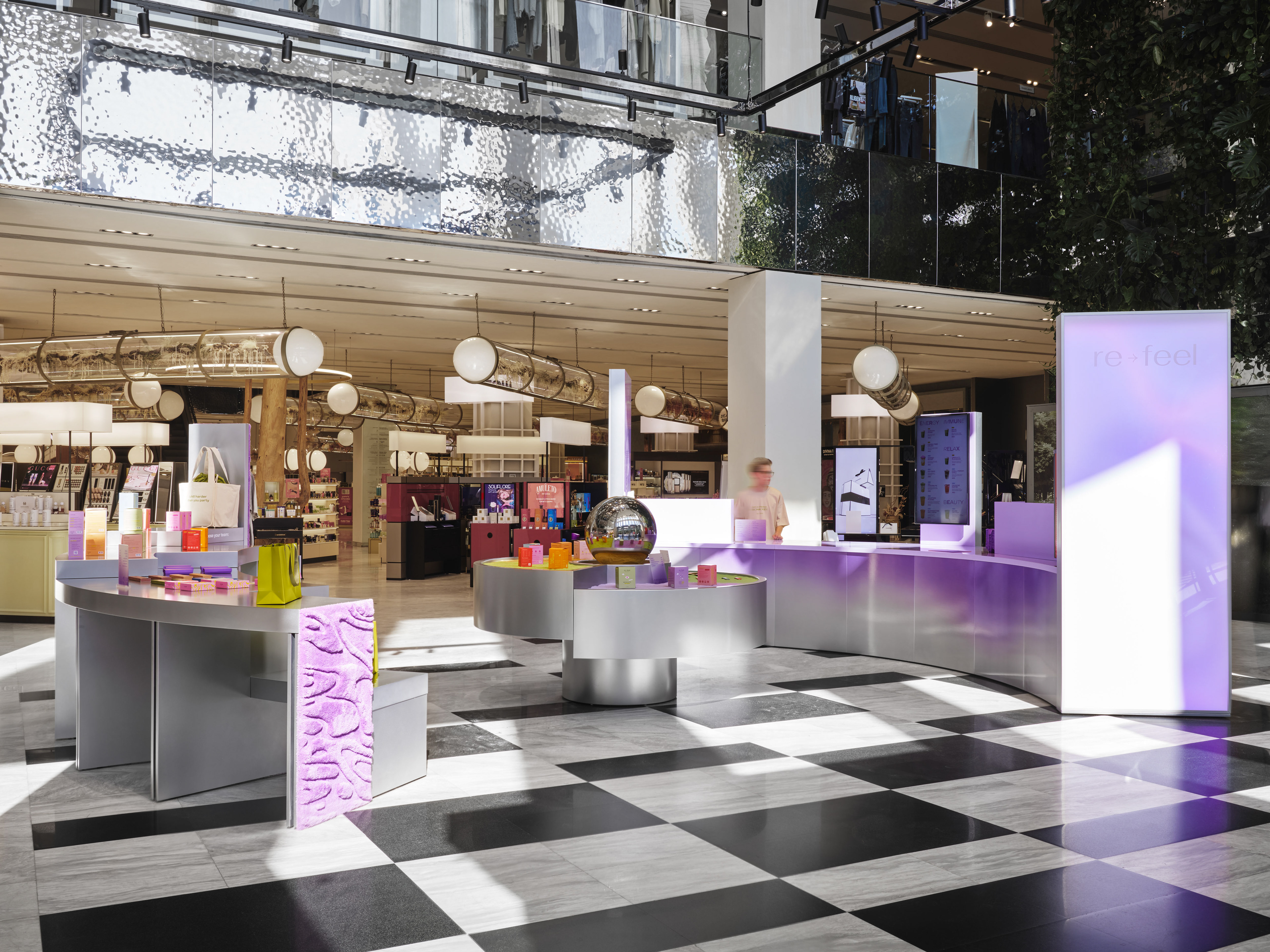 Re-feel’s products are natural, beneficial, and technologically advanced. To highlight these qualities, metallic-effect surfaces and soft color gradients were chosen. For a variety of tactile experiences, materials like sand and tufted rugs from Kovrua were incorporated. To visually balance the space, a large metallic sphere was placed at the center, embodying the technological essence of the brand’s products.